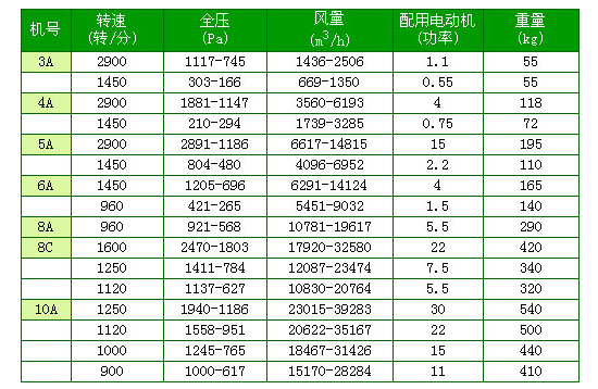 A式为叶轮和电机直联,C式二种,900转-1250转为轴座传动,1250转-1600转为轴承箱传动