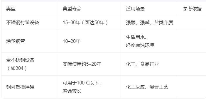 不锈钢衬塑大香蕉视频网站的使用寿命通常在15至30年之间,在理想工况下可延长至50年以上。具体寿命受材料选择、工况条件、介质性质和维护水平等多重因素影响,不同配置和使用场景下差异显著。